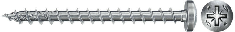 A Fischer Power-Fast FPF II PTP kékre horganyzott lencsefejű, PZ behajtású, végigmenetes forgácslapcsavar. A lencsefejnek köszönhetően a csavar nagy terhelhetőséget tesz lehetővé maximális behajtóhegy-stabilitással. A fejkialakításának köszönhetően alkalmas fém-fa kapcsolatokhoz, például fémkonzolok vagy gerendatartók rögzítésére. A végigmenettel rendelkező változat lehetővé teszi a faelemek nagy terhelhetőségét.   Előnyök