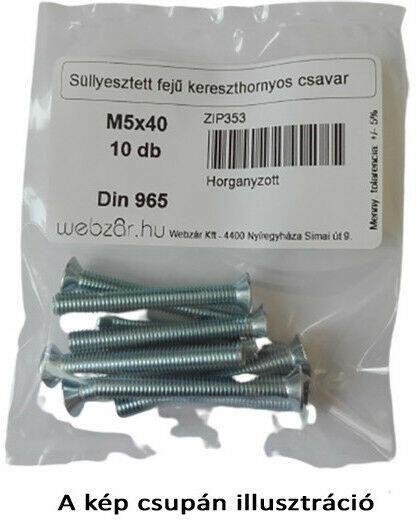 Süllyesztett fejű kereszthornyos csavarok: Tökéletes rögzítés minden projekthez ? 10 db M5x40 méretű, horganyzott acél süllyesztett fejű kereszthornyos csavar DIN 965 szabvány szerint. Ideális bútorok, szerkezetek és egyéb projektek rögzítéséhez. Jellemzők:Méret: M5x40 Mennyiség: 10 db Fej típus: Süllyesztett Horony típus: Kereszthornyos Anyag: Horganyzott acél Szabvány: DIN 965 Előnyök:Strapabíró: A horganyzott acél kiváló korrózióvédelmet biztosít. Sokoldalú: Széles körben alkalmazható különböző projektekhez. Könnyű szerelés: A kereszthornyos fej megkönnyíti a beszerelést. Esztétikus: A süllyesztett fej tiszta és rendezett megjelenést biztosít.
